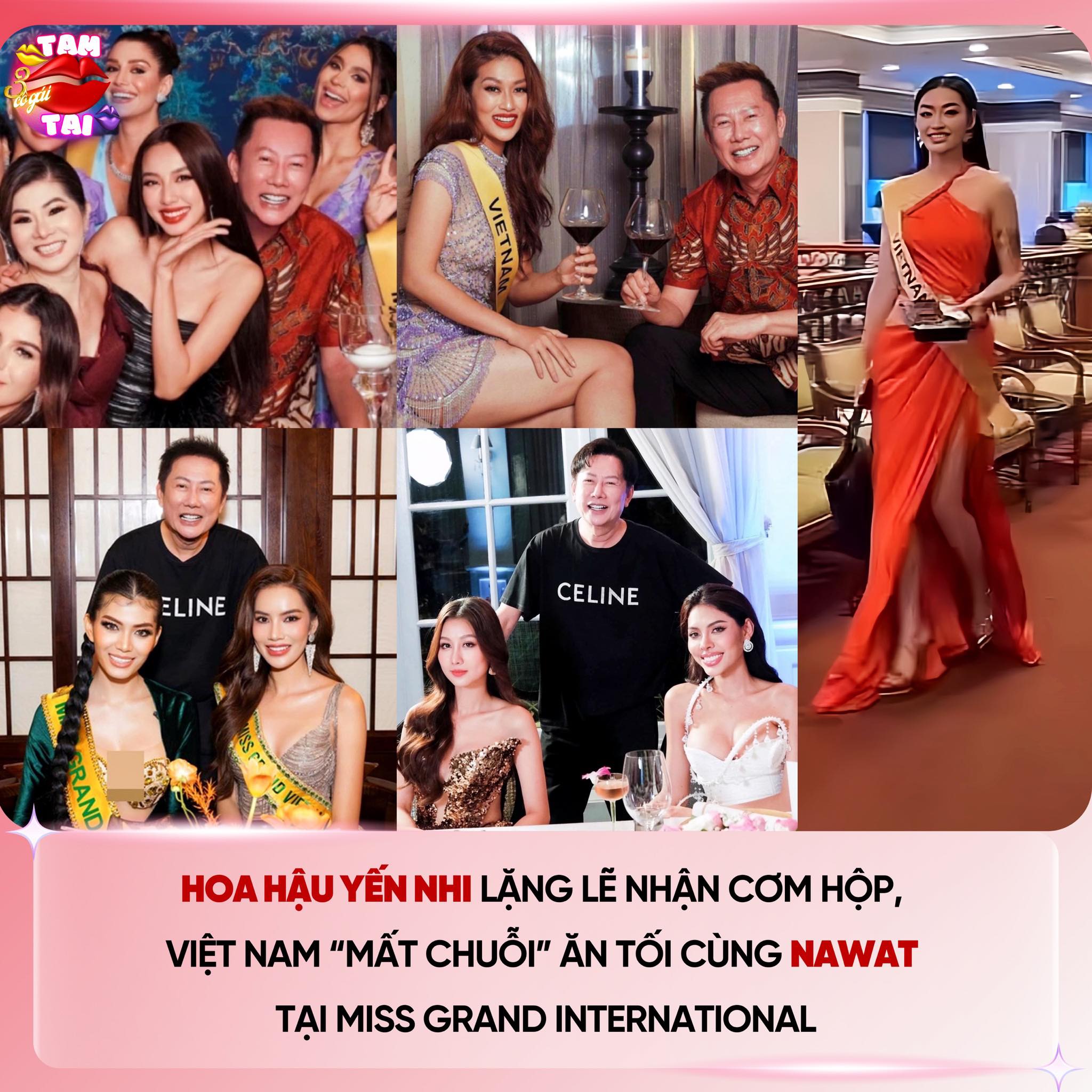 Năm nay, Hoa hậu Yến Nhi – đại diện Việt Nam – dù nhận được nhiều sự ủng hộ từ người hâm mộ trong nước, nhưng không thể tiếp tục nối dài chuỗi chiến thắng. Trong khi các thí sinh khác rạng rỡ dự tiệc cùng ông Nawat, Yến Nhi đành lặng lẽ nhận suất cơm hộp hậu trường.