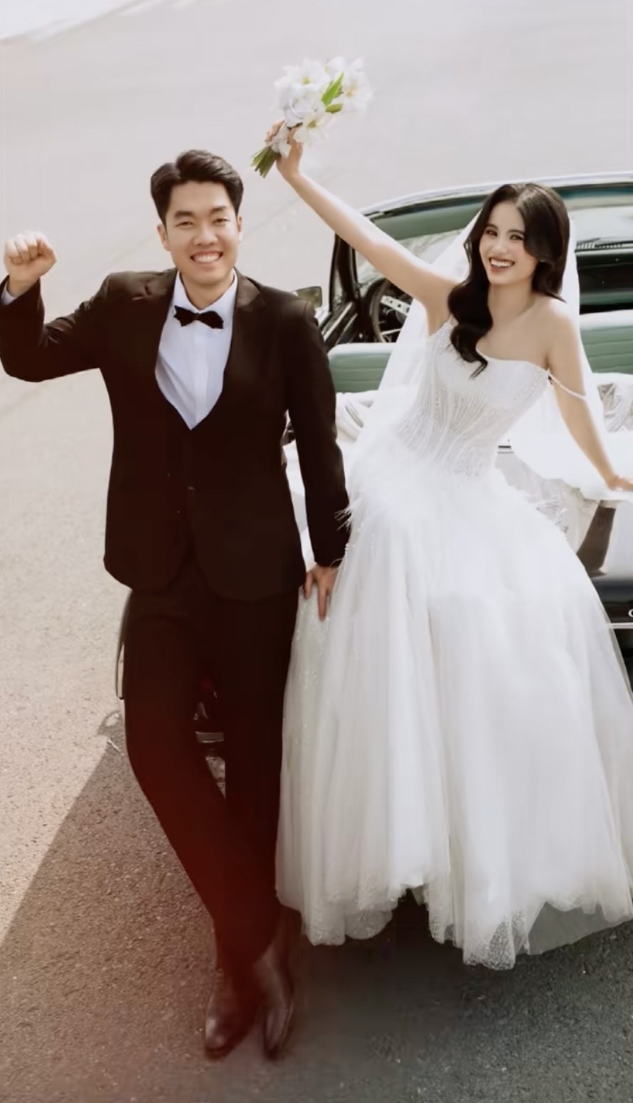 Trong loạt ảnh vừa công bố, Lê Đức Phát xuất hiện lịch lãm với bộ vest đen cổ điển, gương mặt rạng rỡ và ánh mắt tràn đầy hạnh phúc khi nắm tay cô dâu. Bên cạnh anh, Đỗ Thị Ánh Nguyệt khoác lên mình chiếc váy cưới trắng bồng bềnh, tôn lên vẻ dịu dàng nhưng không kém phần rạng ngời. Điểm nhấn đặc biệt của bộ ảnh là khoảnh khắc cô dâu giơ cao bó hoa cưới, trong khi chú rể giơ nắm tay đầy phấn khích.