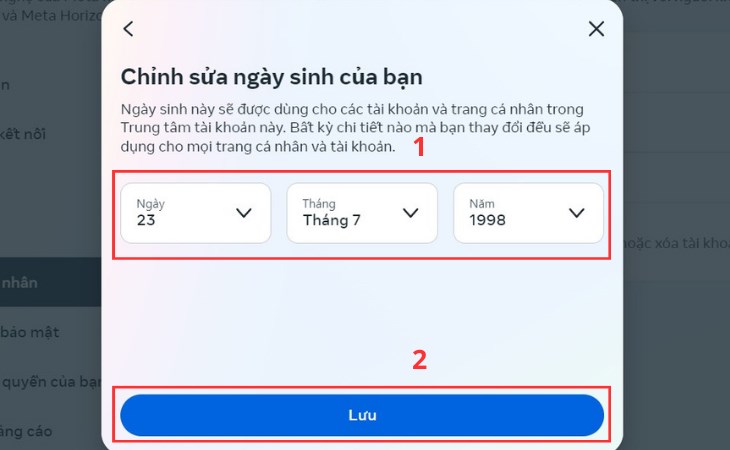 ✅Bước 3: Hãy tùy chỉnh theo nhu cầu sau khi chọn mục Ngày sinh. Tiếp theo, hãy nhấn Lưu và xác nhận để Facebook cập nhật dữ liệu mới nhất.