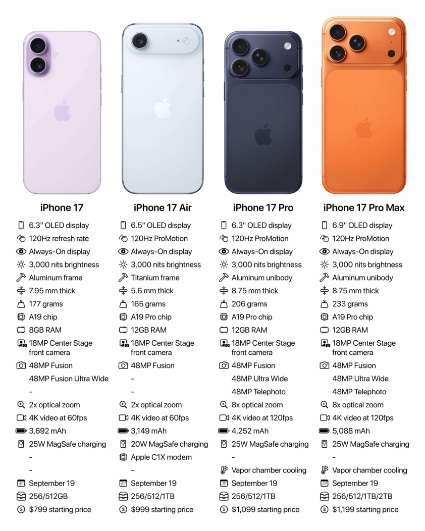 Năm nay, giá bán của iPhone 17 tăng đáng kể so với các thế hệ trước. Theo công bố, iPhone 17 khởi điểm từ 25 triệu đồng cho bản 256GB và 31,5 triệu đồng cho bản 512GB, với 5 màu sắc gồm tím oải hương, xanh lá xô thơm, xanh lam khói, trắng và đen.
