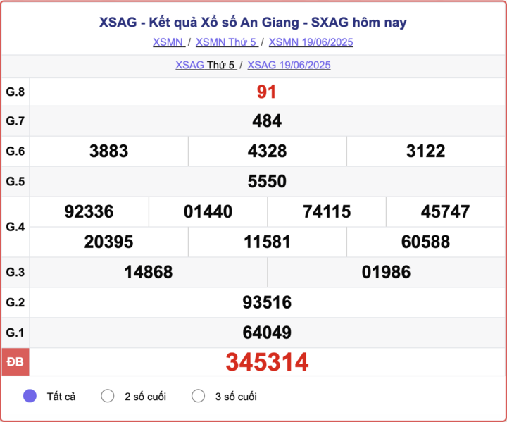 XSAG 19/6, kết quả xổ số An Giang hôm nay 19/6/2025.