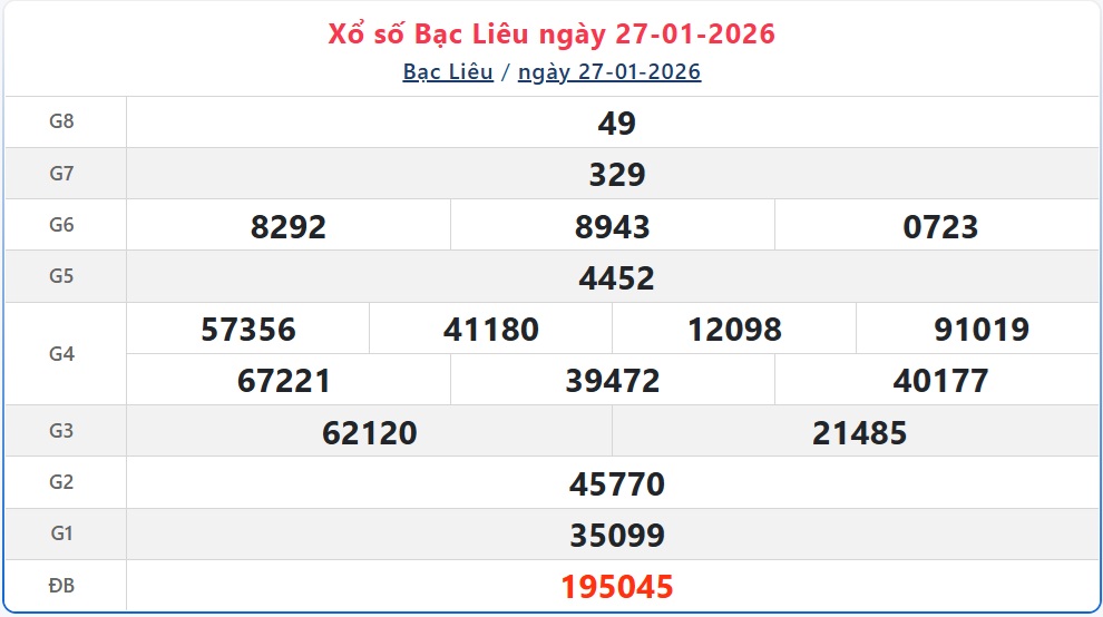 Kết quả xổ số Bạc Liêu ngày 27/1/2026