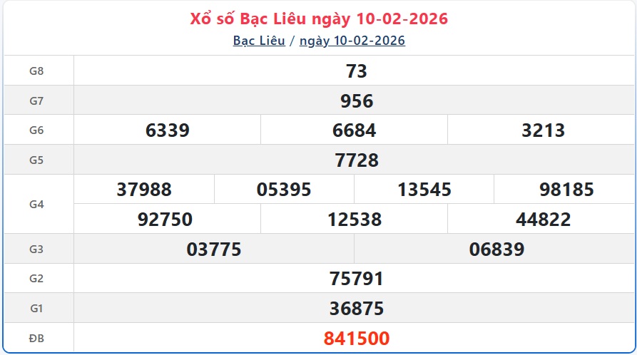 Theo dõi kết quả xổ số Bạc Liêu hôm nay 10/2/2026 nhanh chóng và chính xác nhất để không bỏ lỡ thời gian nhận thưởng.
