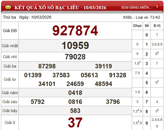 Kết quả xổ số Bạc Liêu Thứ Ba ngày 10/3/2026