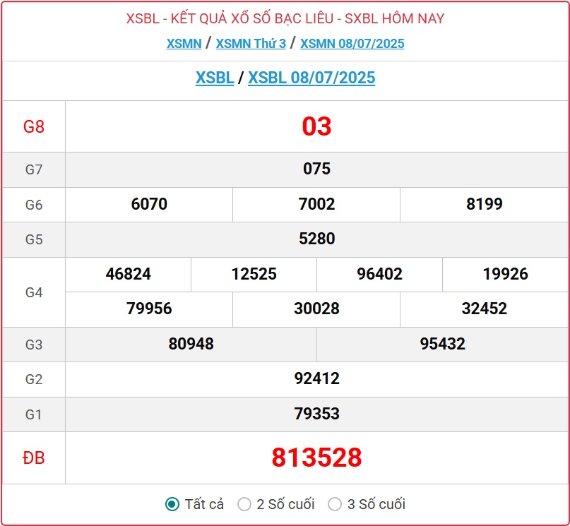 XSBL 5/8. Kết quả xổ số hôm nay ngày 5/8. XSBL Thứ Ba. Trực tiếp KQXSBL ngày 5/8. Kết quả xổ số Bạc Liêu hôm nay ngày 5/8/2025. Kết quả xổ số Bạc Liêu Thứ Ba ngày 5/8/2025.