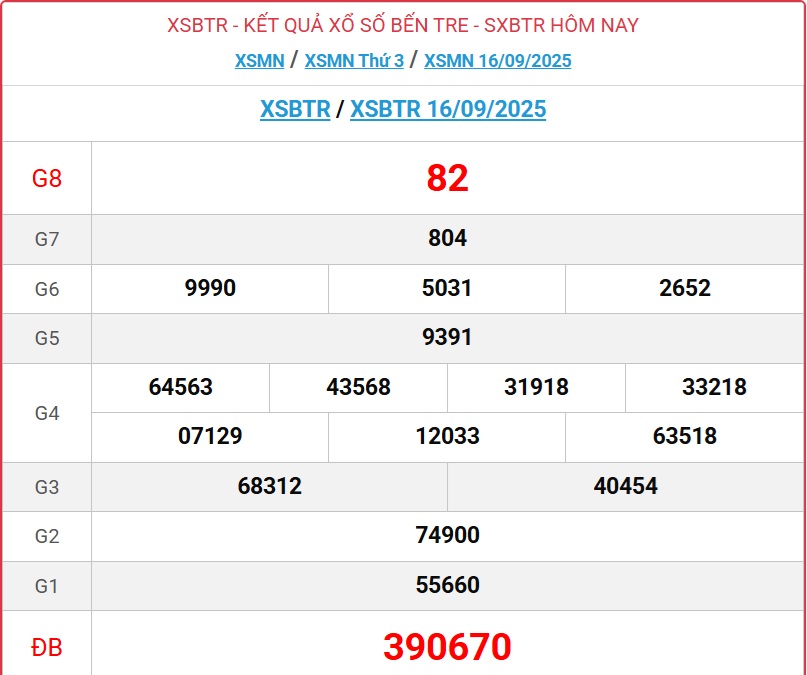 Kết quả xổ số Bến Tre hôm nay 14/10/2025 được quay vào lúc 16 giờ 15 phút vào ngày Thứ Ba hàng tuần, mở thưởng bởi Công ty TNHH MTV Xổ số kiến thiết Bến Tre và bắt đầu từ giải tám cho đến giải nhất, cuối cùng là công bố giải đặc biệt.