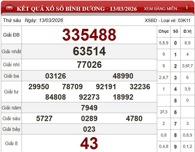Kết quả xổ số Bình Dương ngày 13/3/2026