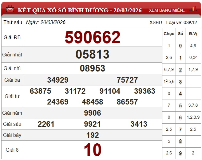 Theo dõi kết quả xổ số Bình Dương hôm nay ngày 27/3/2026 nhanh chóng và chính xác nhất để không bỏ lỡ thời gian nhận thưởng.