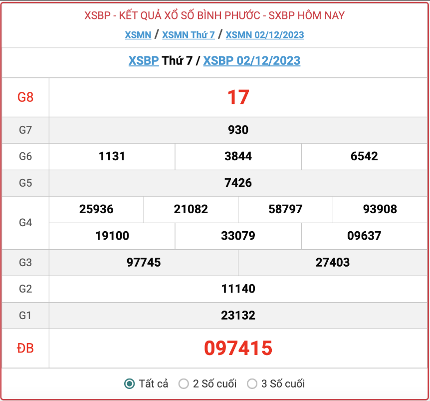 - Kết quả XSBP ngày 2/12/2023