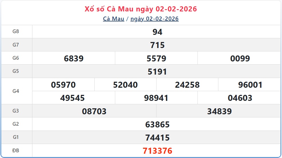 Kết quả xổ số Cà Mau ngày 2/2/2026