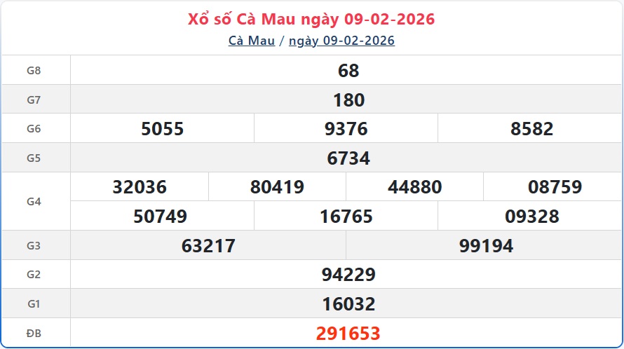 Kết quả xổ số Cà Mau thứ Hai ngày 9/2/2026