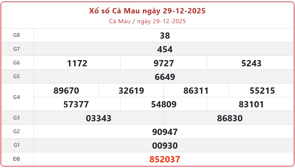 Kết quả xổ số Cà Mau ngày 29/12/2025