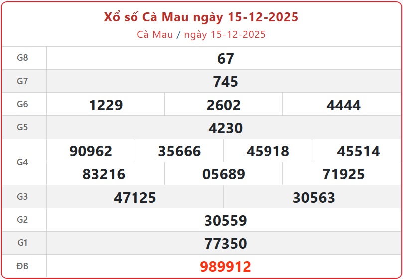 Kết quả xổ số Cà Mau ngày 15/12/2025