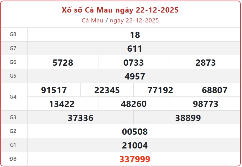 Kết quả xổ số Cà Mau ngày 22/12/2025