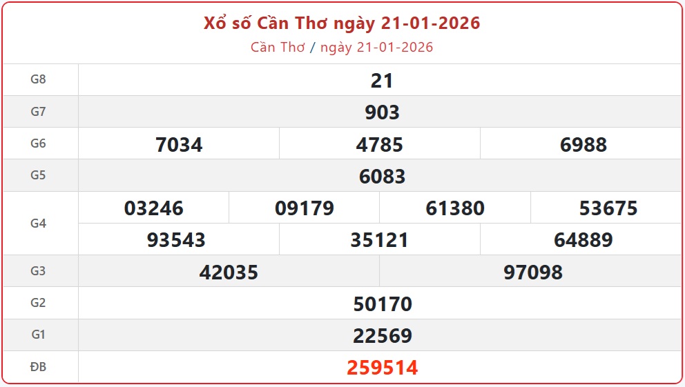 Theo dõi kết quả xổ số Cần Thơ hôm nay 21/1/2026 nhanh chóng và chính xác nhất.