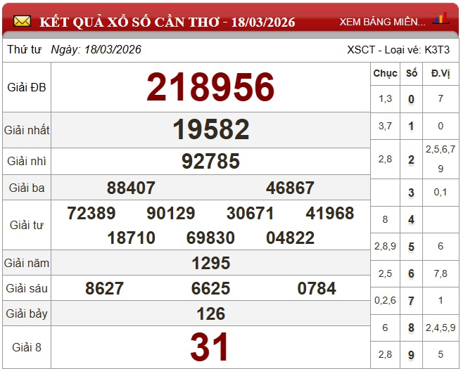 Kết quả xổ số Cần Thơ ngày 18/3/2026