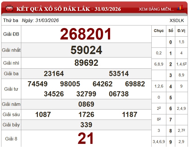 Kết quả xổ số Đắk Lắk Thứ Ba ngày 31/3/2026