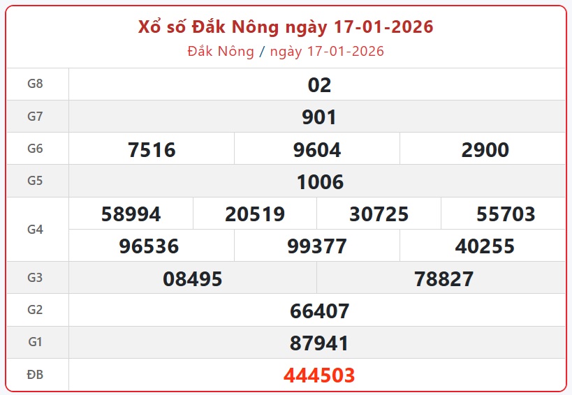 Theo dõi kết quả xổ số Đắk Nông hôm nay 17/1/2026 nhanh chóng và chính xác nhất để không bỏ lỡ thời gian nhận thưởng.