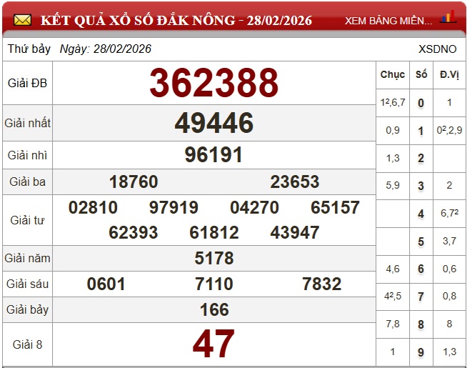 Kết quả xổ số Đắk Nông ngày 28/2/2026