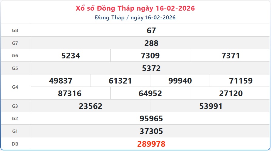 Kết quả xổ số Đồng Tháp ngày 16/2/2026