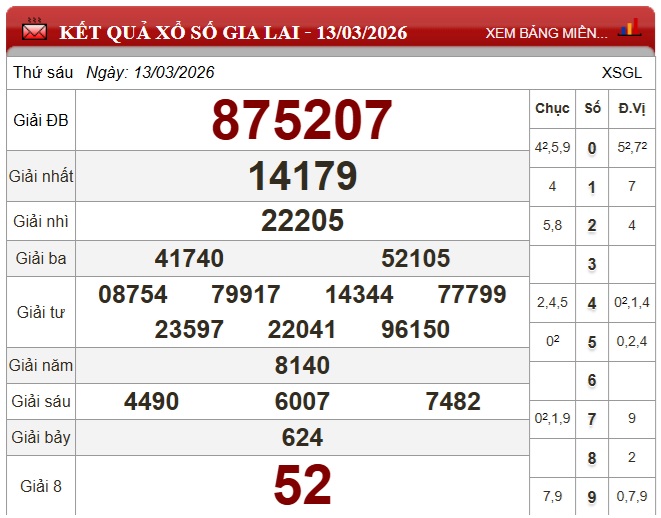 Kết quả xổ số Gia Lai ngày 13/3/2026