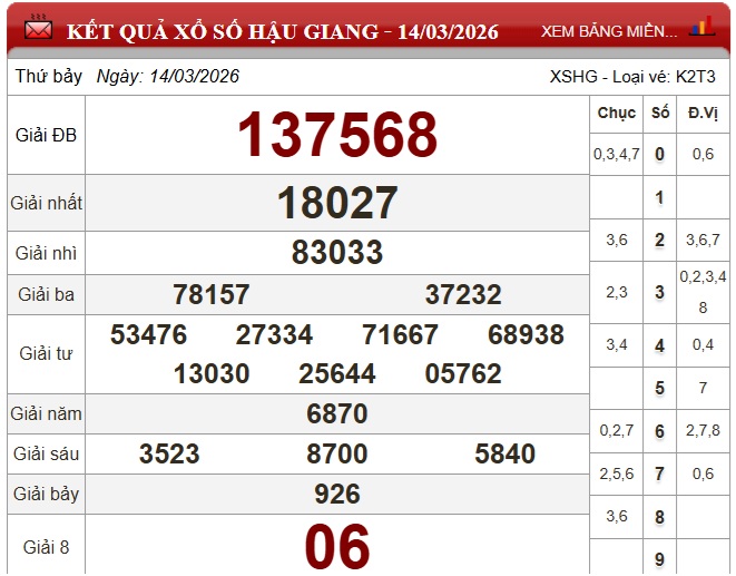 Kết quả xổ số Hậu Giang ngày 14/3/2026