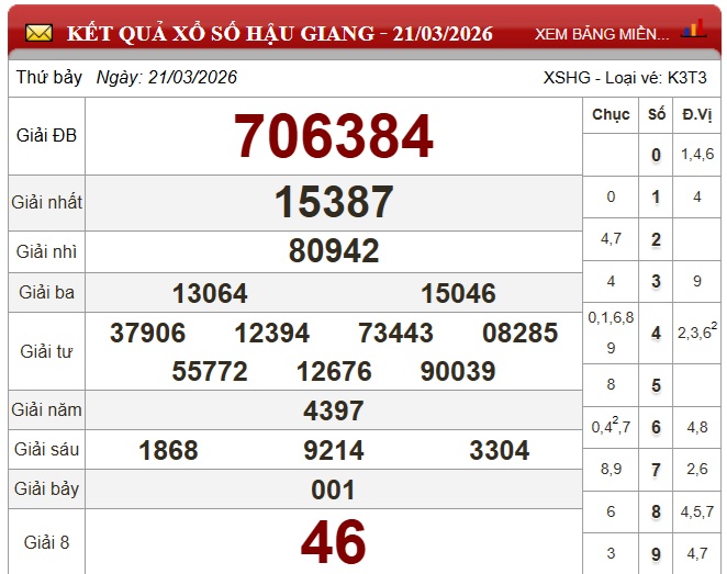 Kết quả xổ số Hậu Giang ngày 21/3/2026