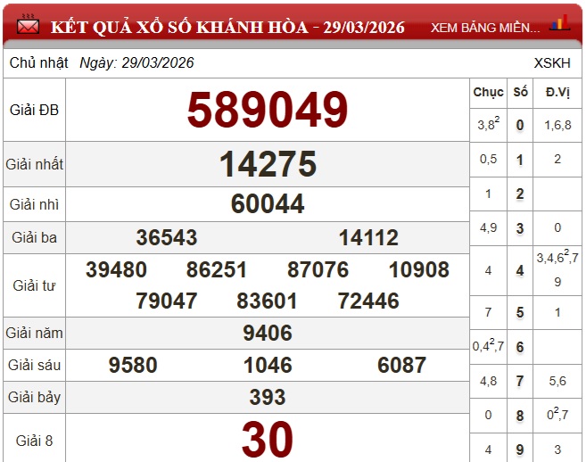 Kết quả xổ số Khánh Hòa ngày 29/3/2026