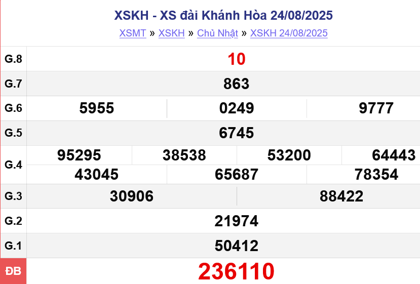 Kết quả xổ số Khánh Hòa hôm nay 10/9/2025 được quay thưởng vào lúc 17h15 bởi Công ty TNHH MTV Xổ số kiến thiết Khánh Hòa. Kết quả các giải thưởng XSKH 10/9/2025 được công bố lần lượt từ giải nhất cho đến giải tám, cuối cùng là giải đặc biệt.
