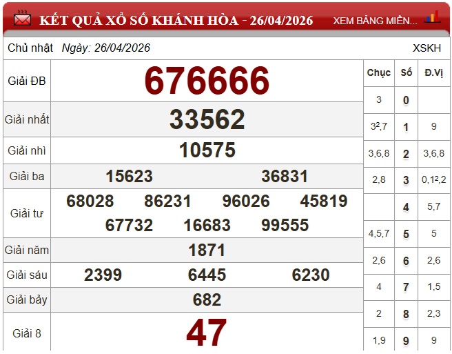 Theo dõi kết quả xổ số Khánh Hòa hôm nay 26/4/2026 để cập nhật kết quả nhanh và chính xác nhất
