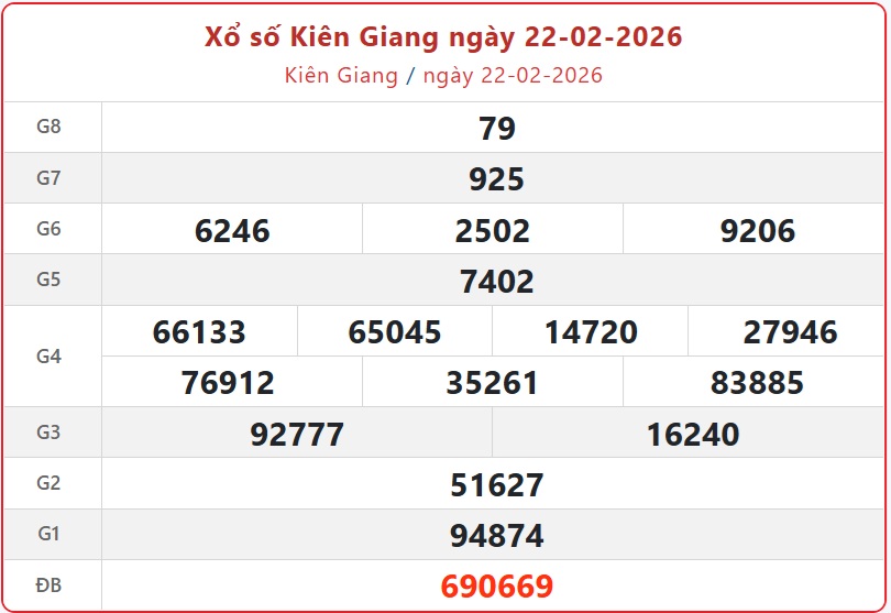Kết quả xổ số Kiên Giang ngày 22/2/2026