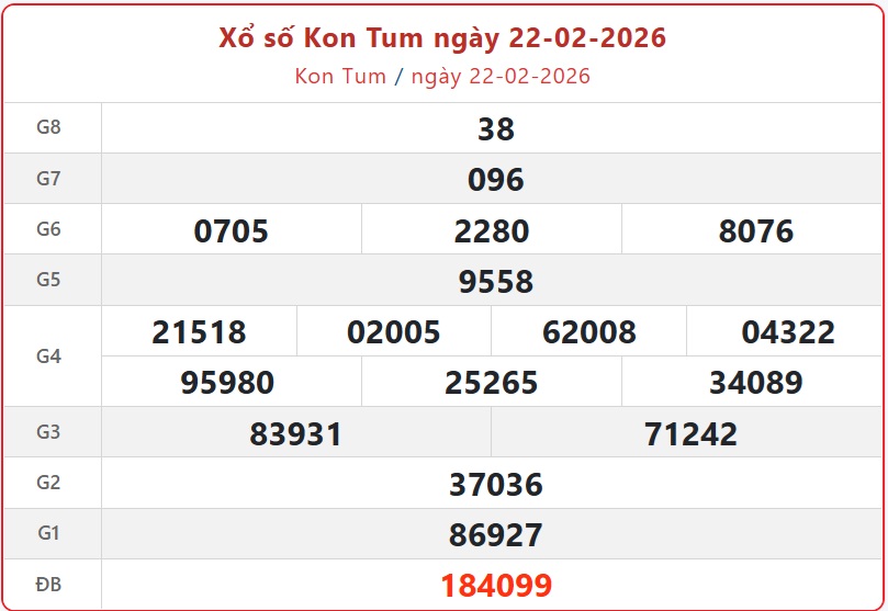 Kết quả xổ số Kon Tum ngày 22/2/2026