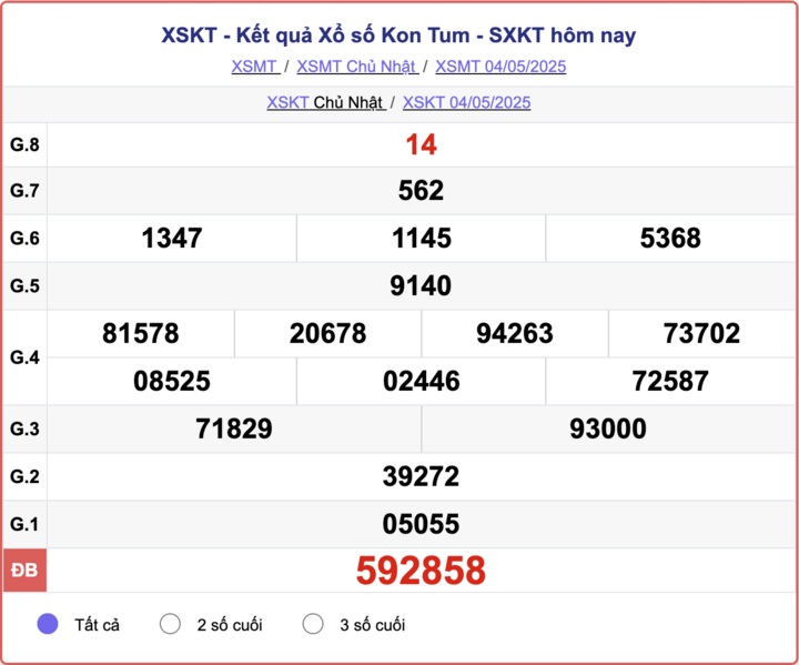 Trực tiếp Kết quả xổ số Kon Tum hôm nay - Kết quả XSKT 11/5 - XSKT hôm nay chủ nhật ngày 11/5/2025 - Xổ số Kon Tum hôm nay - Trực tiếp xổ số Kon Tum hôm nay