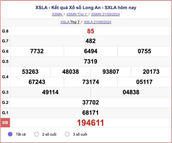 XSLA 28/9. Kết quả xổ số Long An hôm nay - XSLA thứ Bảy ngày 28/9/2024 sẽ được cập nhật nhanh chóng và chính xác nhất trên phuongtruongan.vn. Kết quả các giải thưởng XSLA ngày 28/9/2024 sẽ được cập nhật liên tục từ giải nhất cho đến giải tám, cuối cùng là giải đặc biệt.