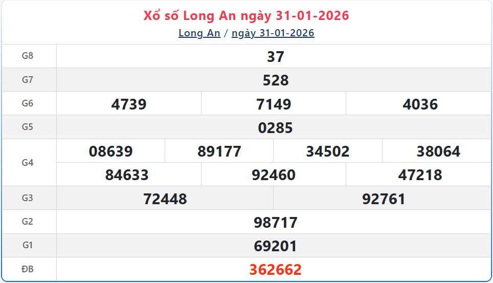 Trực tiếp Kết quả xổ số Long An hôm nay - Kết quả XSLA 31/1 - XSLA hôm nay Thứ Bảy ngày 31/1/2026