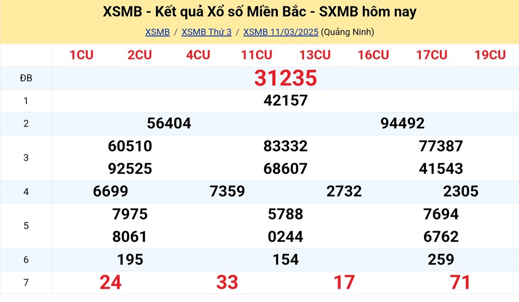 Kết quả xổ số miền Bắc (XSMB) được thực hiện lúc 18 giờ 15 phút và được mở thưởng bởi Công ty xổ số kiến thiết Bắc Ninh (XSBN). Xổ số hôm nay - KQXSMB ngày 12/3 được quay thưởng bắt đầu từ giải nhất cho đến giải bảy, cuối cùng là công bố kết quả giải đặc biệt.