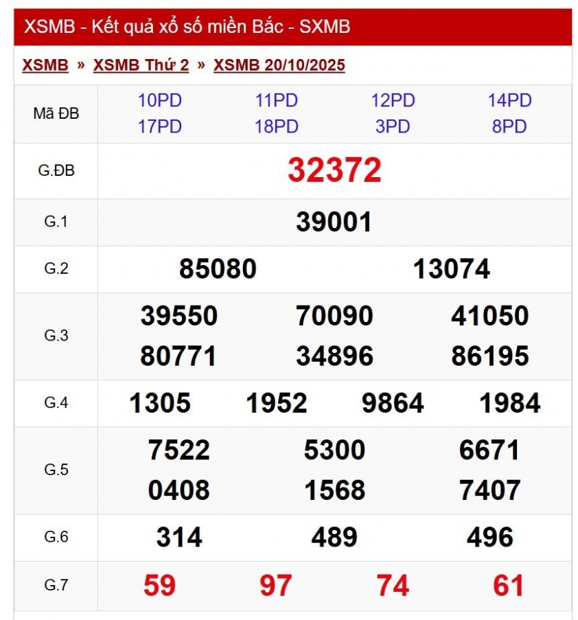 - Kết quả xổ số miền Bắc ngày 20/10. KQXSMB 20/10/2025. XSMB 20/10