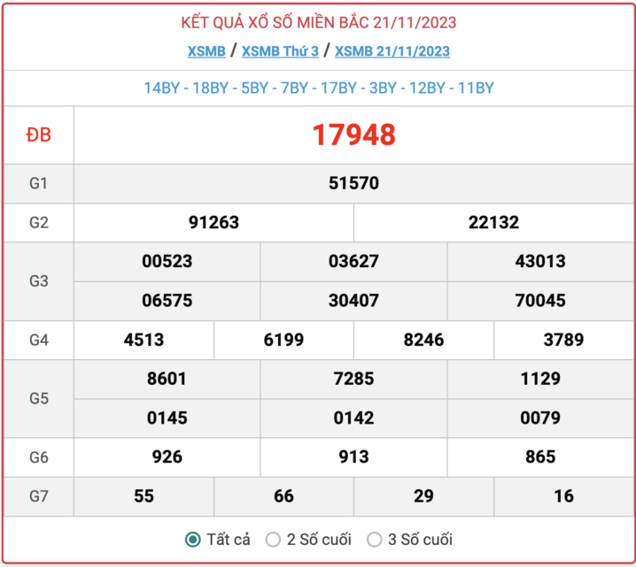 XSMB thứ 3, kết quả xổ số miền Bắc ngày 21/11/2023