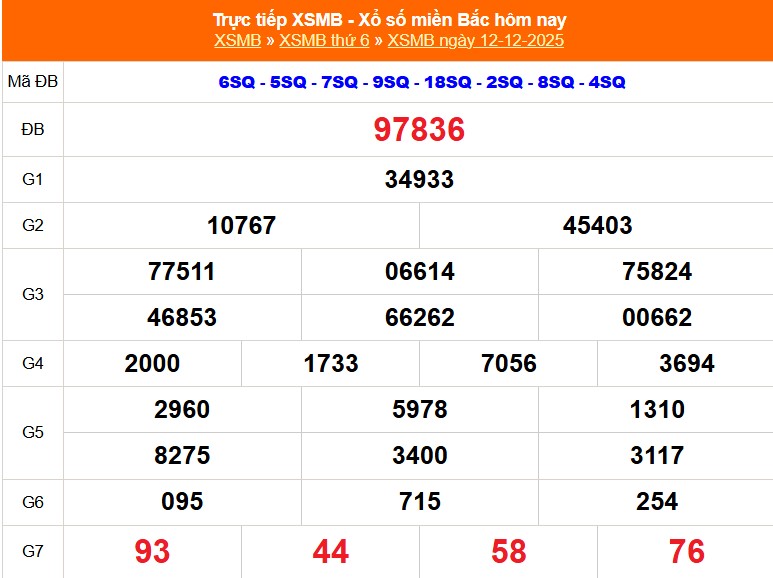 Kết quả Xổ số miền Bắc ngày 12/12/2025