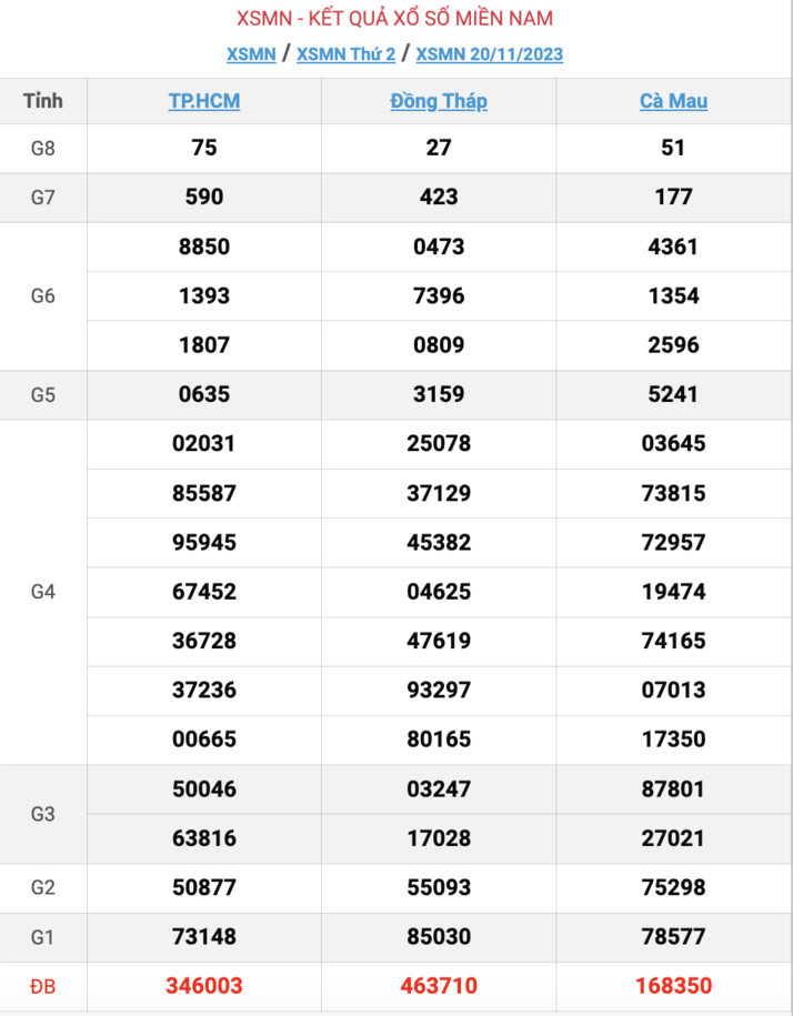 Kết quả XSMN ngày 20/11/2023