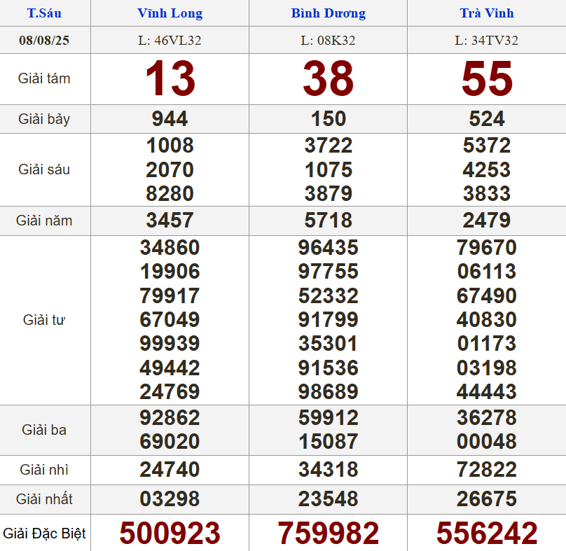 - Thứ 6 hàng tuần xổ số miền Nam được quay thưởng tại Trà Vinh, Bình Dương, Vĩnh Long.