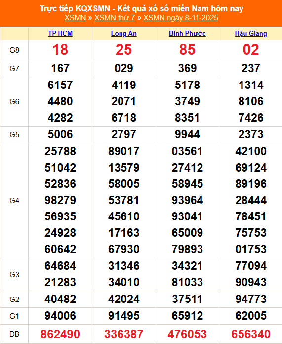 Kết quả xổ số miền Nam ngày 8/11/2025