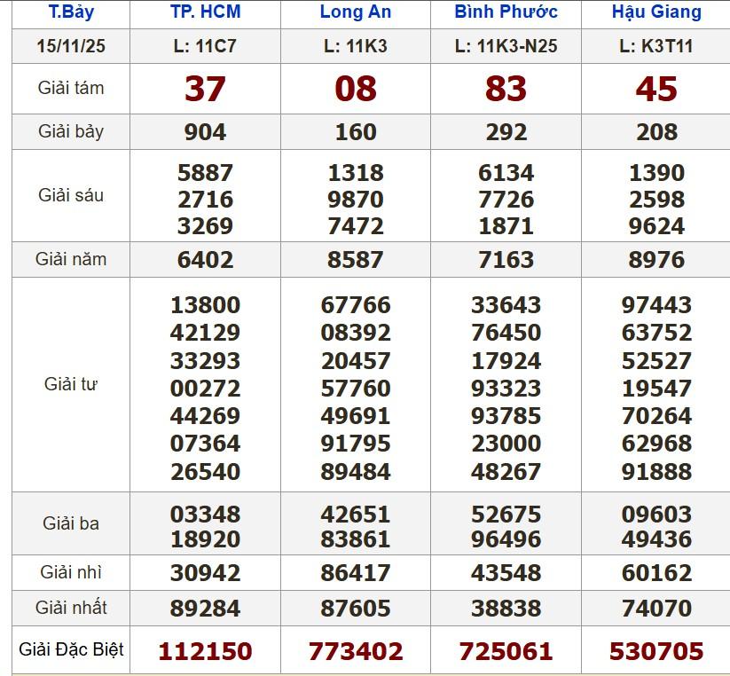 Kết quả xổ số miền Nam (XSMN) được thực hiện lúc 16 giờ 30 phút và được mở thưởng bởi Công ty xổ số kiến thiết của Tp Hồ Chí Minh (XSHCM), Bình Phước (XSBP), Hậu Giang (XSHG), Long An (XSLA). Kết quả của đài nào sẽ được mở thưởng tại trường quay của tỉnh đó. Xổ số hôm nay - KQXSMN ngày 15/11 được quay thưởng bắt đầu từ giải tám cho đến giải nhất, cuối cùng là công bố kết quả giải đặc biệt.