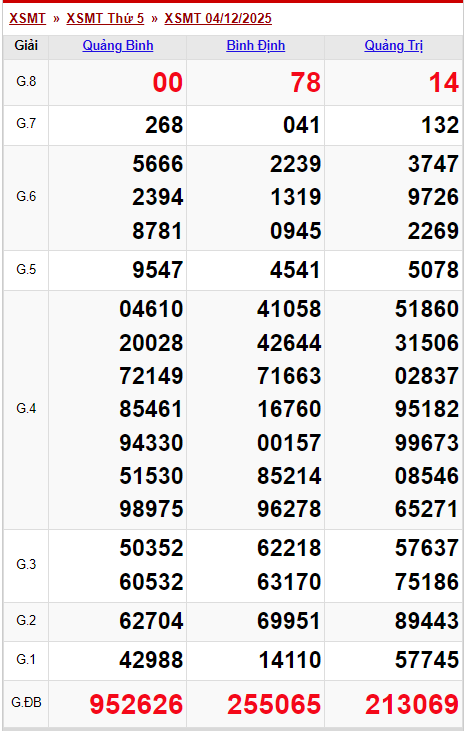 Kết quả xổ số miền Trung (XSMT) được thực hiện lúc 16 giờ 30 phút và được mở thưởng bởi Công ty xổ số kiến thiết của tỉnh Bình Định (XSBĐ), Quảng Trị (XSQT) và Quảng Bình (XSQBI). Kết quả của đài nào sẽ được mở thưởng tại trường quay của tỉnh đó. Xổ số hôm nay - KQXSMT ngày 4/12 được quay thưởng bắt đầu từ giải tám cho đến giải nhất, cuối cùng là công bố kết quả giải đặc biệt.