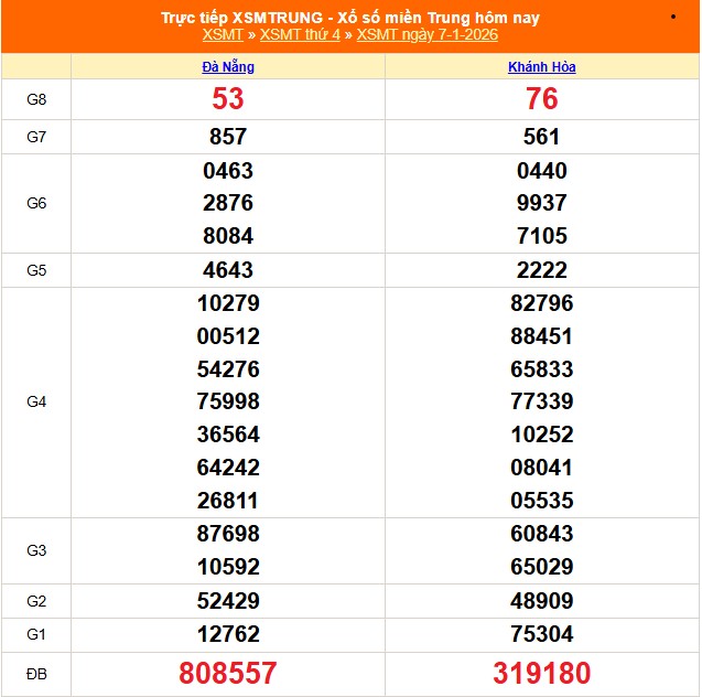 Kết quả xổ số miền Trung (XSMT) được thực hiện lúc 16 giờ 30 phút và được mở thưởng bởi Công ty xổ số kiến thiết của tỉnh Đà Nẵng (XSĐNA), Khánh Hòa (XSKHA). Kết quả của đài nào sẽ được mở thưởng tại trường quay của tỉnh đó. Xổ số hôm nay - KQXSMT ngày 7/1 được quay thưởng bắt đầu từ giải tám cho đến giải nhất, cuối cùng là công bố kết quả giải đặc biệt.
