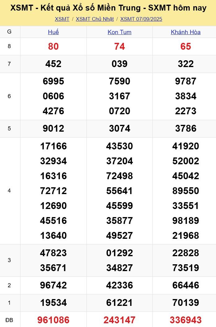 Kết quả xổ số miền Trung (XSMT) được thực hiện lúc 16 giờ 30 phút và được mở thưởng bởi Công ty xổ số kiến thiết của tỉnh Quảng Nam (XSQNA), Đắk Lắk (XSĐL). Kết quả của đài nào sẽ được mở thưởng tại trường quay của tỉnh đó. Xổ số hôm nay - KQXSMT ngày 9/9 được quay thưởng bắt đầu từ giải tám cho đến giải nhất, cuối cùng là công bố kết quả giải đặc biệt.