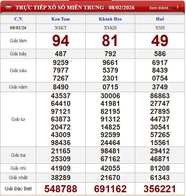 Kết quả xổ số miền Trung ngày 8/2/2026