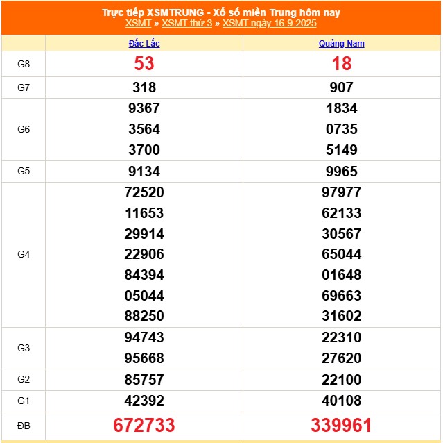 - Thứ Ba: Kết quả xổ số miền Trung (XSMT) mở thưởng bởi 2 đài Đắk Lắk (XSDLK) và Quảng Nam (XSQNA).