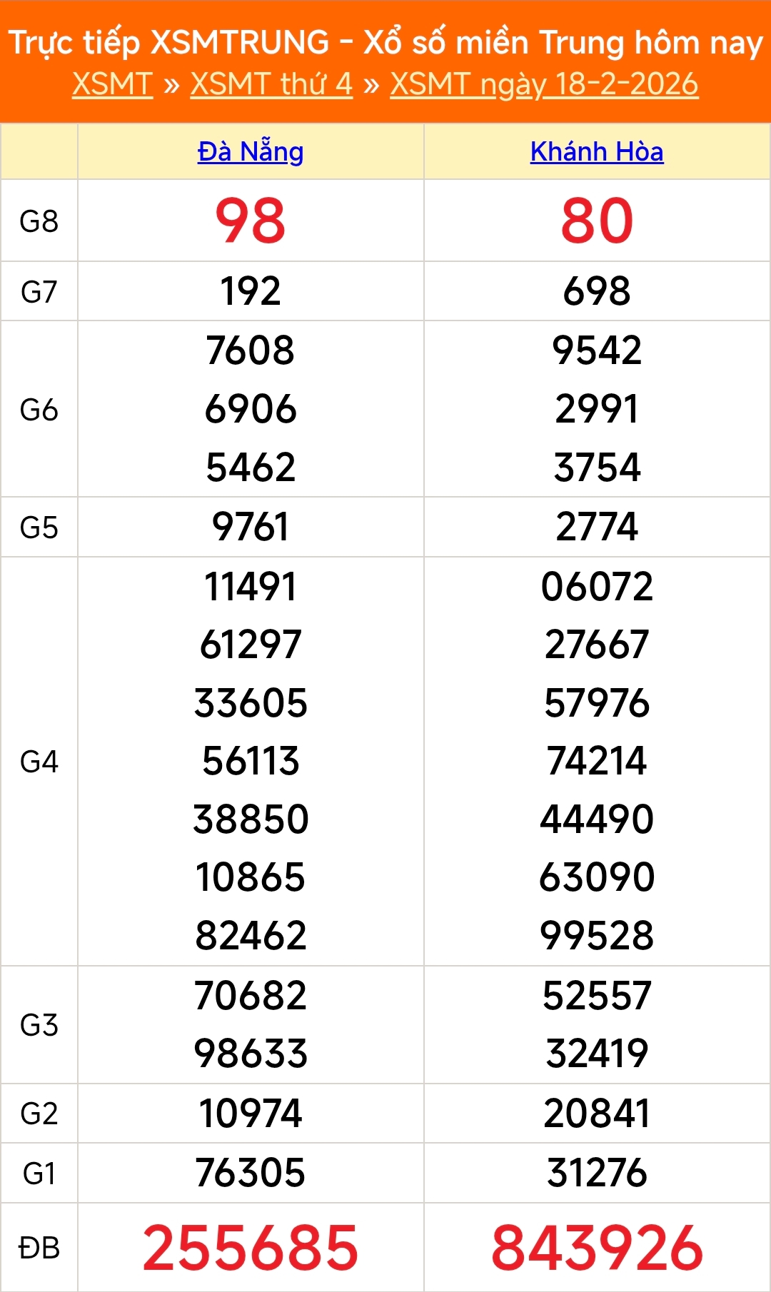 Kết quả xổ số miền Trung ngày 18/2/2026