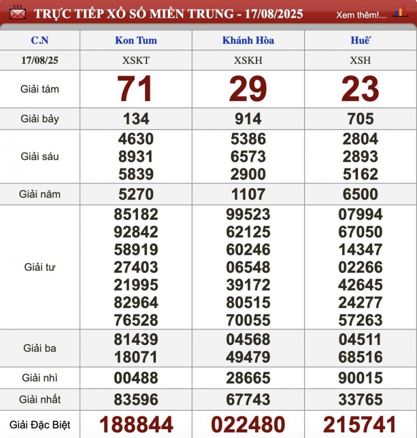 - Xổ số miền Trung chủ nhật được mở thưởng tại Kon Tum, Khánh Hòa, Thừa Thiên Huế